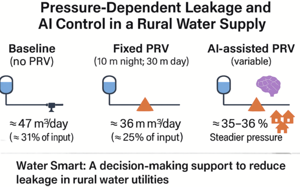 Results showed that the fixed PRV strategy reduced daily leakage by approximately 24% without compromising service levels. The AI-assisted PRV achieved comparable leakage reduction while maintaining more stable pressures throughout the day. To facilitate practical application, a Python-based decision-support tool was developed, enabling non-specialist operators to simulate and evaluate control strategies with minimal input data and Excel-based outputs. The findings demonstrate that effective pressure management, whether through simple mechanical solutions or advanced optimization, can significantly reduce leakage and improve reliability in rural water systems. This approach offers a scalable, low-cost pathway for enhancing water supply sustainability in developing regions.
